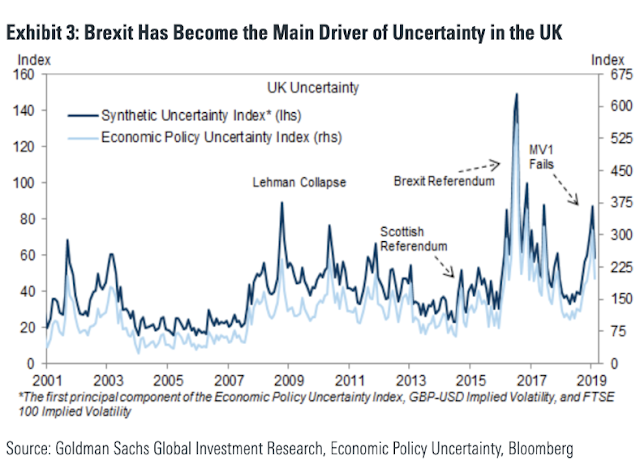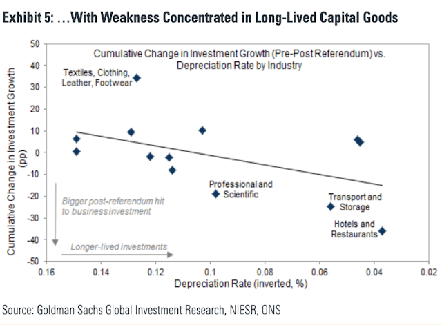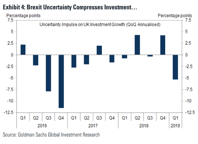 Δεδομένου ότι το μεγαλύτερο μέρος αυτής της (θεωρητικής) απώλειας έχει αποδοθεί στις επιχειρηματικές επενδύσεις, η Goldman έχει παραθέσει ότι οι αναλυτές έχουν υποτιμήσει τις επιπτώσεις της “πολιτικής αβεβαιότητας” γύρω από τη διαδικασία Brexit.