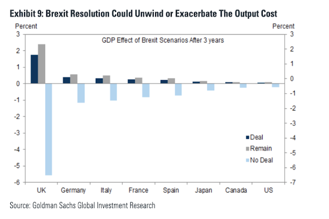 Για το σκοπό αυτό, οι αναλυτές της Goldman Sachs, οι οποίοι έχουν καταγράψει λεπτομερώς το σήριαλ του Brexit μετά το δημοψήφισμα, προσπάθησαν να ποσοτικοποιήσουν τον οικονομικό αντίκτυπο του Brexit στα δυόμισι χρόνια μετά το δημοψήφισμα.