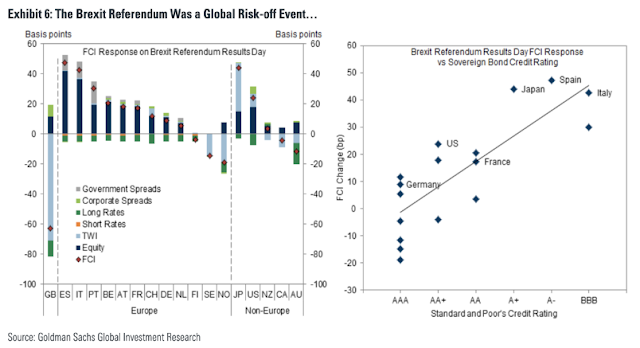 Κοιτάζοντας πέρα από τα βρετανικά νησιά, η Goldman Sachs έδειξε πώς το αποτέλεσμα του δημοψηφίσματος Brexit ξεπέρασε τις παγκόσμιες αγορές, ασκώντας το μεγαλύτερο αντίκτυπο στο πιο επικίνδυνο χρέος σε ολόκληρο τον κόσμο, αλλά κυρίως στην Ευρώπη.